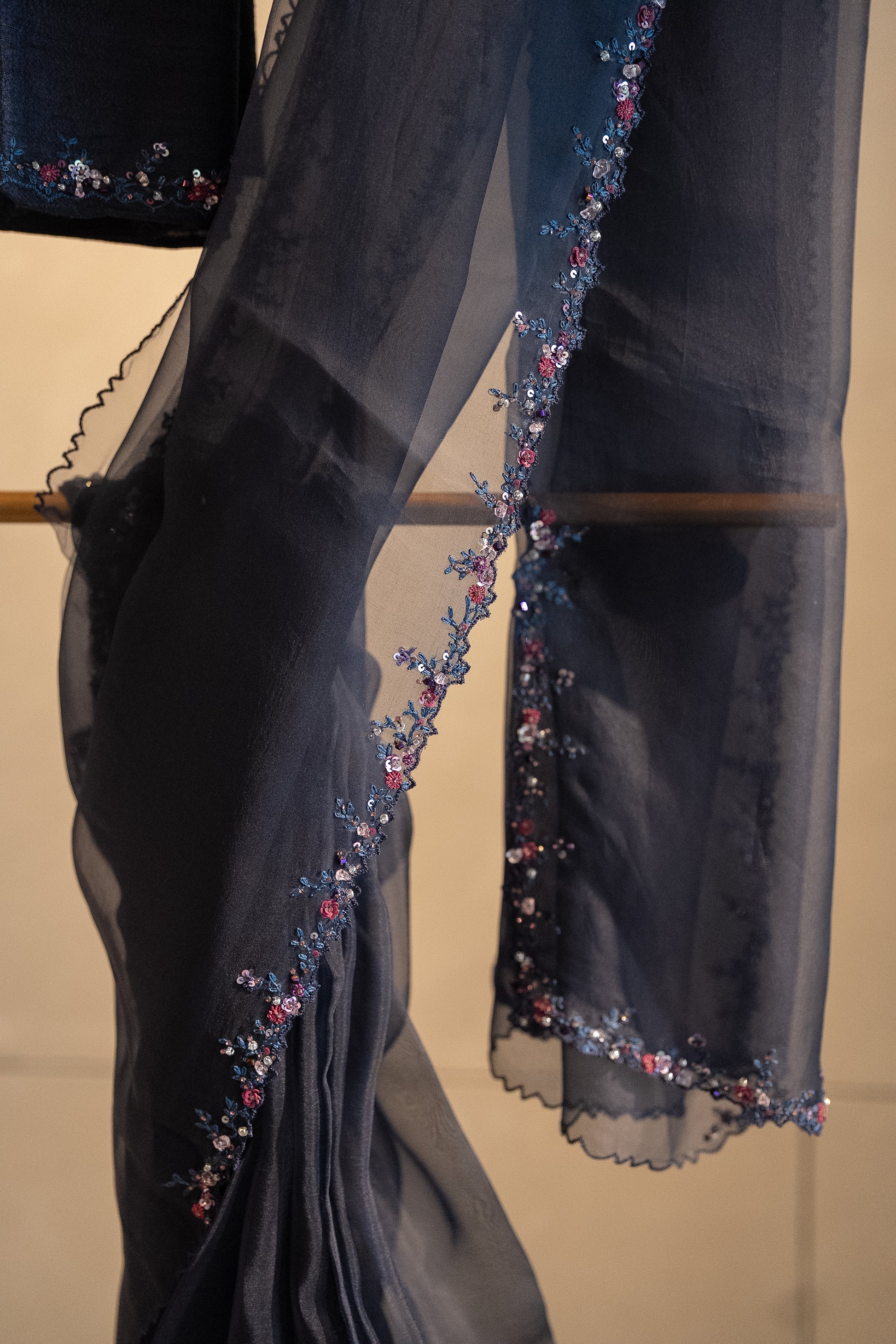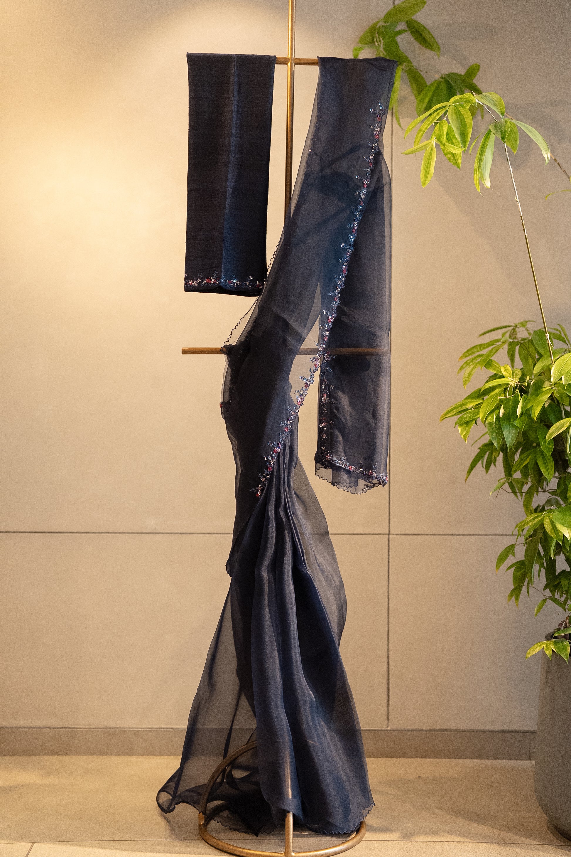Specification : Deep Blue pure organza saree embellished with floral embroidery highlighted with stones , crystals and knots and its paired with an unstitched pure rawsilk blouse fabric with floral embroidery on sleeve edges