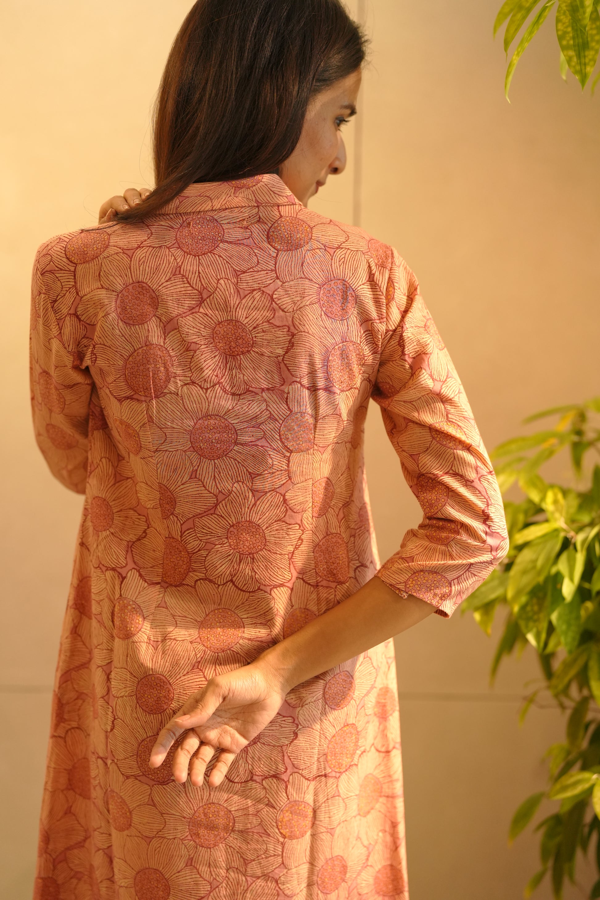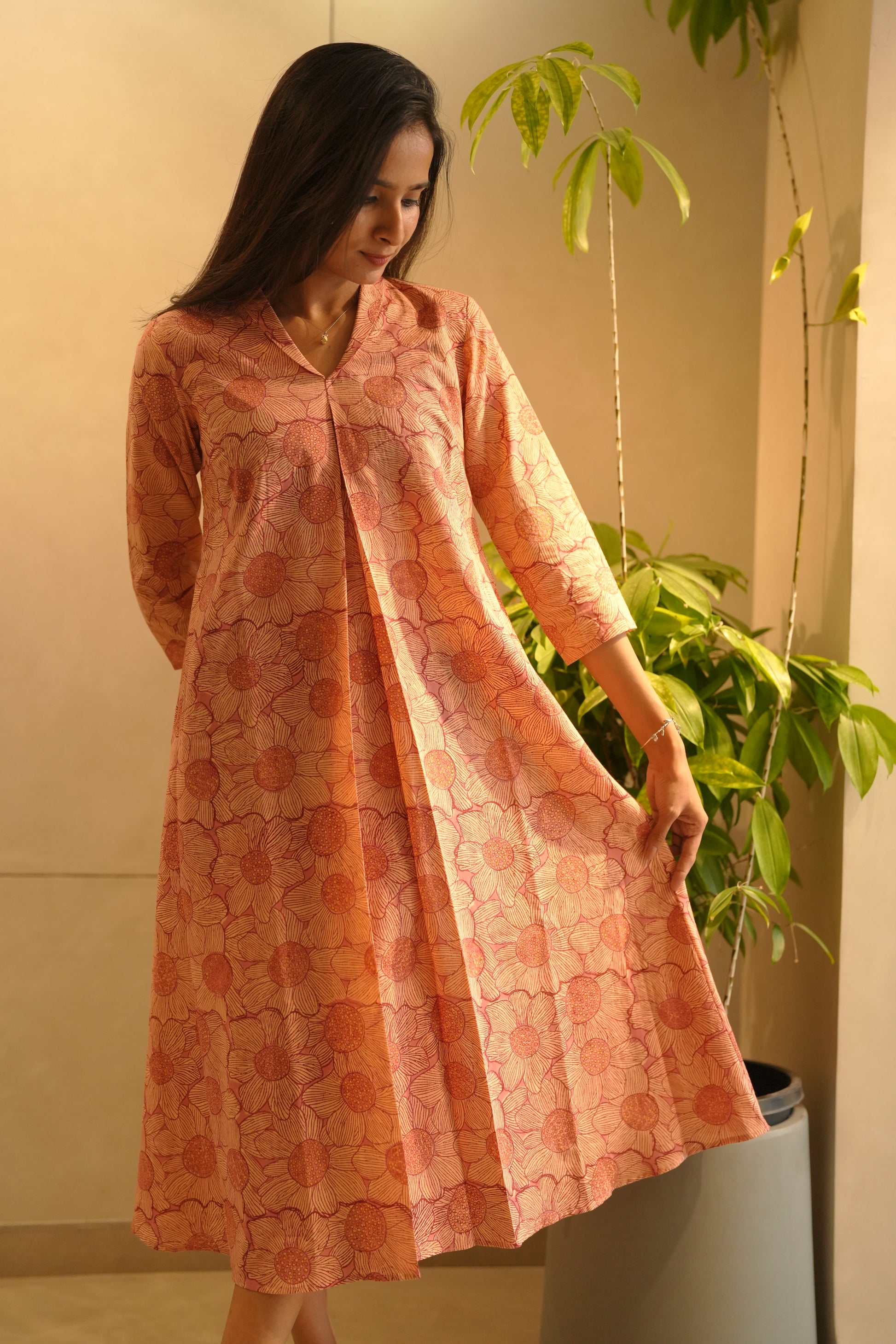 Specification: Peach and pink floral printed cotton frock with folding collar merging into an inverted pleat and 3/4th sleeves