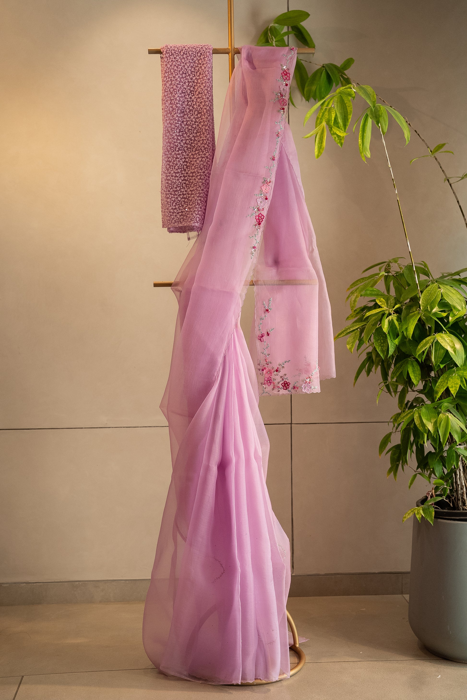 Specification : Lavender organza saree embellished with embossed floral bunches paired with an unstitched net embroidery blouse fabric