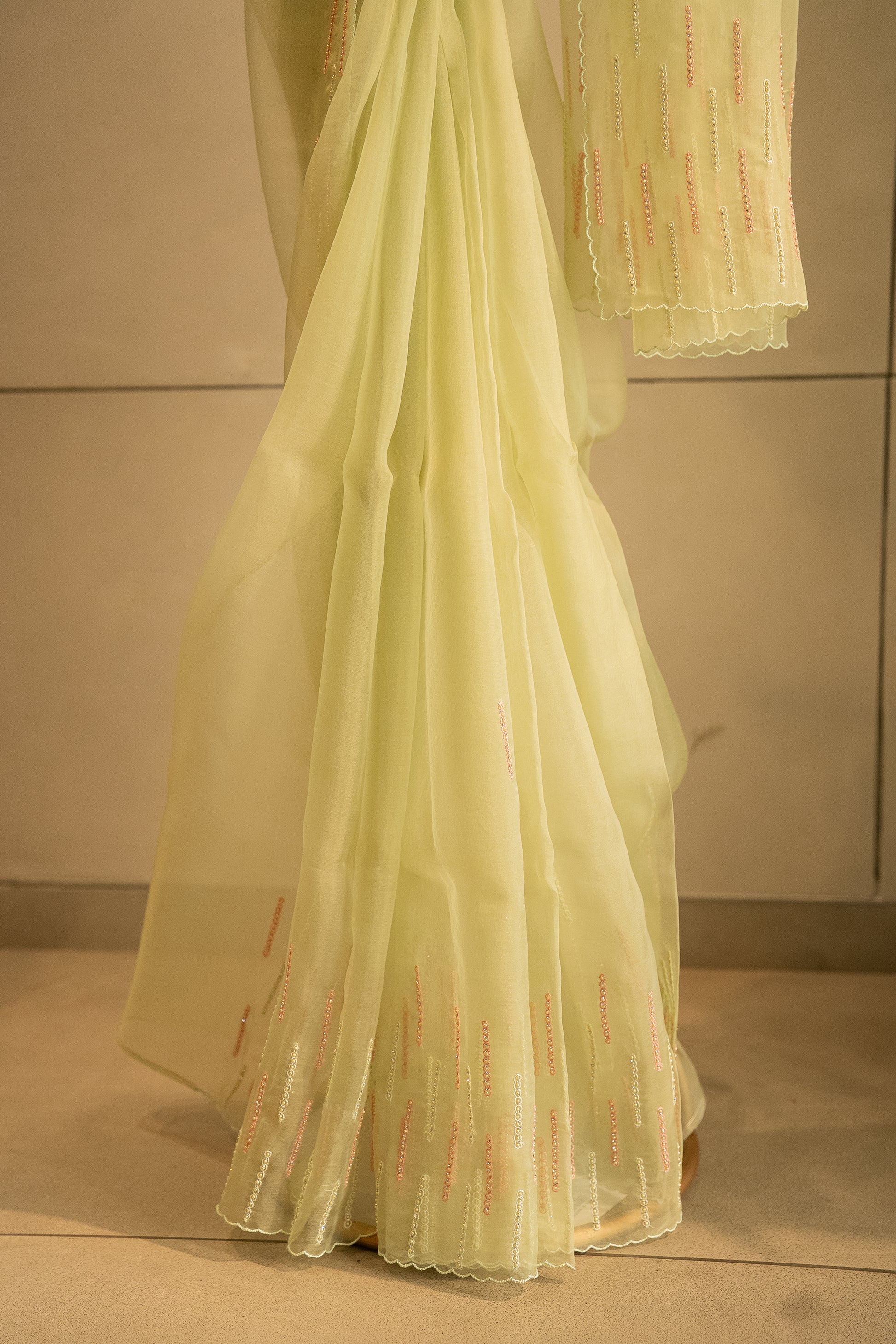 Specification : Lime green pure organza saree embellished with line motifs paired with unstitched embroidered semi- dupion silk blouse piece