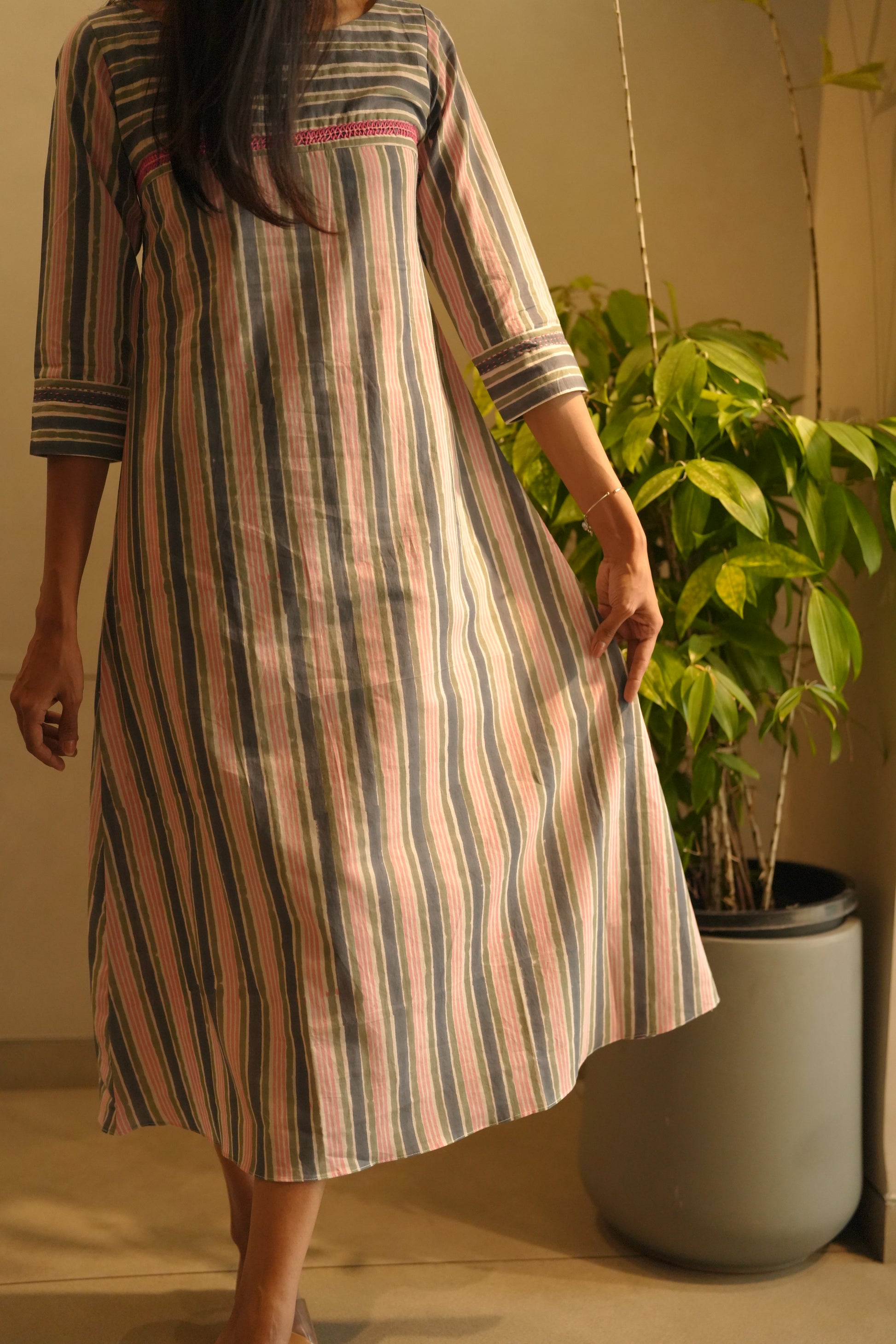 Specification: Multi coloured striped cotton frock featuring a boat neck and horizontally striped yoke with pink thread works